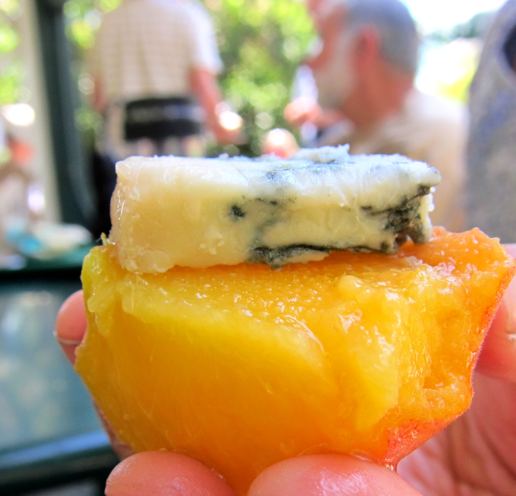 I will always go for warmth and not cold. Peach ice cream I can take or leave. It gets lost – it could be anything pretty and fragrant-smelling. A peach is itself more when baked, poached or simply wondrously ripe and filled with the coldest of blue cheeses. I understand the puree thing, but then I miss the shape; those delicate mounds in a tart, perfect circles like cobblestones running down a street. I know what I’m getting and that’s part of the pleasure. I can imagine it before it arrives. I once saw a lady peel and wash a tomato with its own skin. I like doing this to ripe fruit and it works well with peaches. I like the skin, but I want the flesh, so I keep peeling. A very ripe peach will slip off its skin almost in one. The hussy.