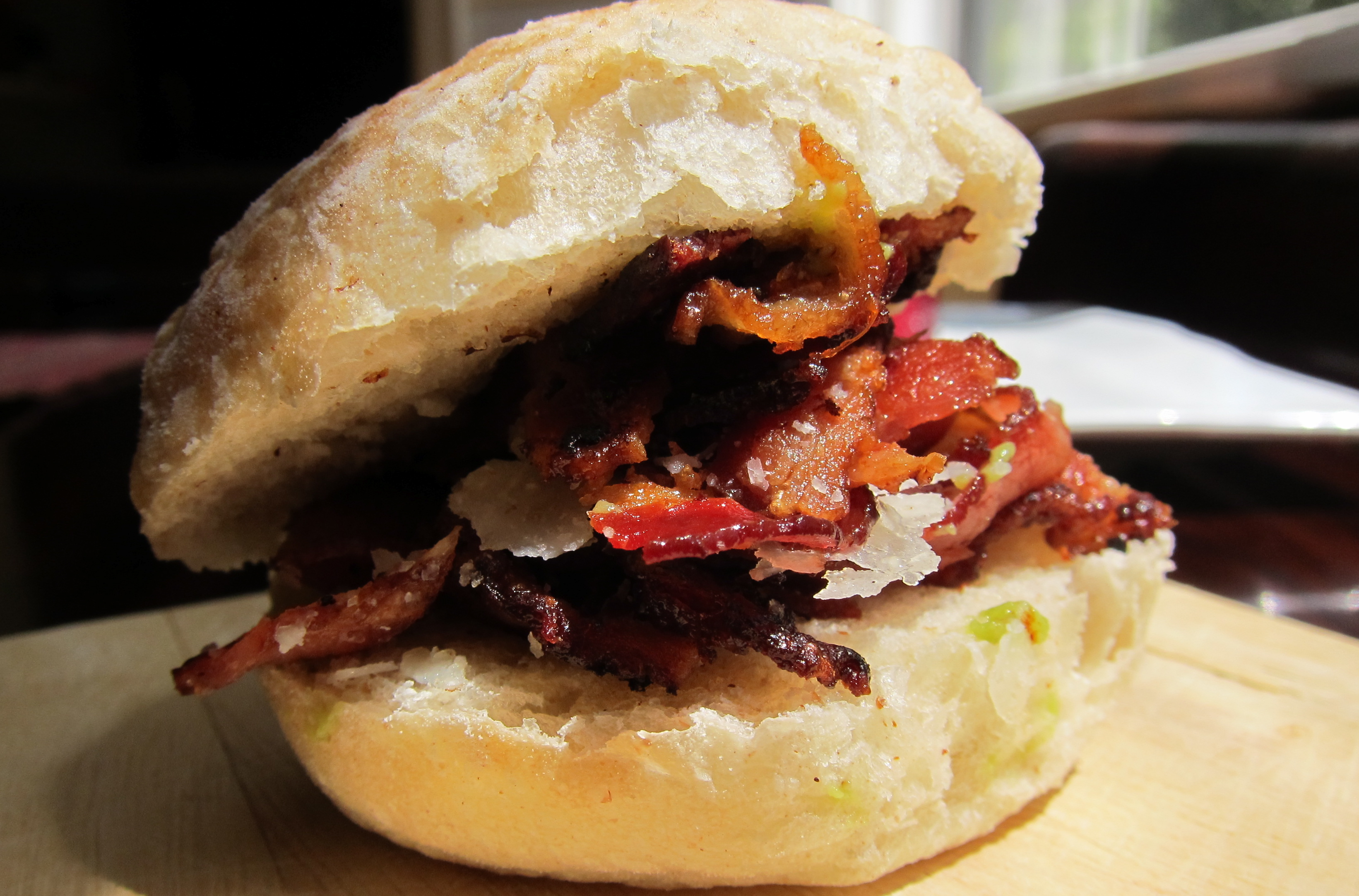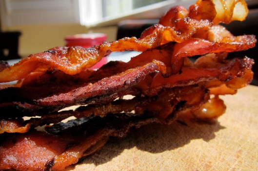 Life would not be complete without bacon. I even love Frazzles – pretend rashers eaten as potato chips – which is about as far as you can get from the real thing, and yet, there’s still something, a shadow, a tantalizing reminder. Bacon is dressed up now in all sorts of eclectic fare. You’ve got your candied bacon ice cream, your bacon muffins, your chocolate-covered bacon. But nothing beats a bacon butty. Even the name spells hope in the morning. One bite and you know that everything is right with the world. Muffled bread and sweet splinters of saltiness.